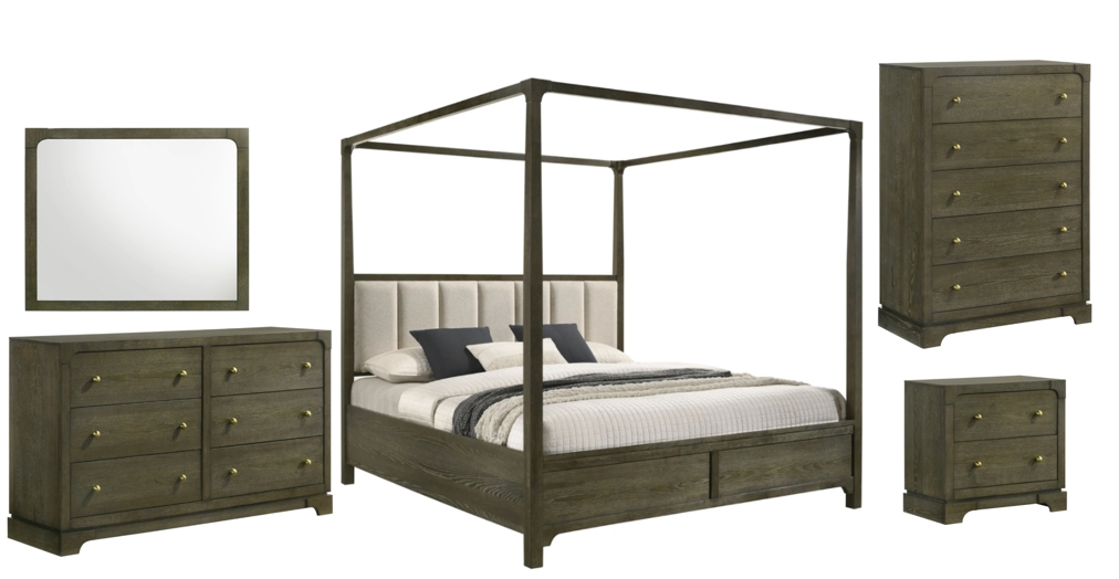 Includes: One (1) queen bed, one (1) nightstand, one (1) dresser, one (1) dresser mirror, and one (1) chest