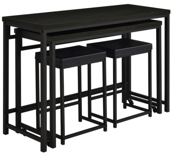 This 4-piece counter height set includes a table with built-in storage and three matching stools. Perfect for small spaces, it offers a practical solution for dining, working, or casual gatherings. The dark charcoal finish complements a variety of interiors while maximizing functionality.Read More