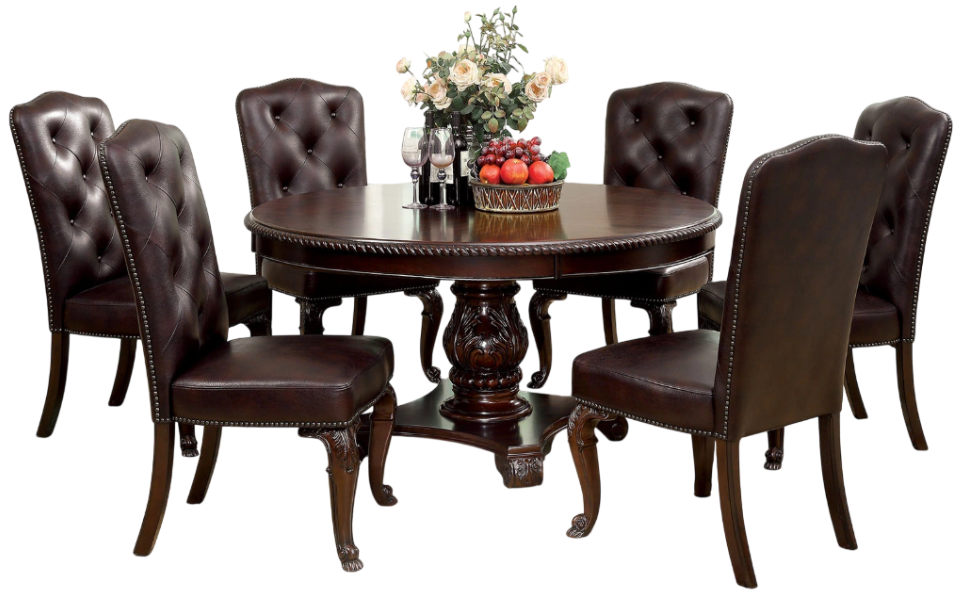 The centerpiece of this set is the beautiful pedestal table, which comes in two styles, adorned with intricate designs on the base and the apron. Three options for the side chairs are offered, as well as a matching mirror and server finished in brown cherry.Read More