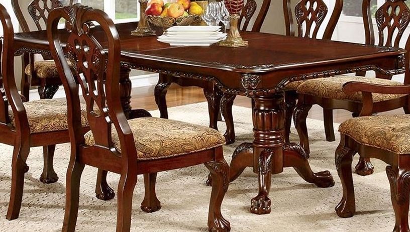 Classic elements are at the forefront with this brown cherry finished collection. The intricately designed chair backs match beautifully with the meticulously carved table, while the padded fabric seat cushions offer both comfort and style.Read More