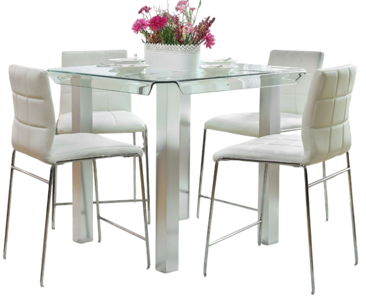 Quite the attention grabber, this collection will immediately become the focal point of your home. Family and friends are sure to admire your fine taste when they lay eyes on this one-of-a-kind table. Bold posts create a sturdy base for the 12mm temp ered glass top featuring smooth, curved edges. Contrasting the thick table legs are thin chrome legs on the chairs with padded leatherette seats and backs. This set is available in both standard and counter height.