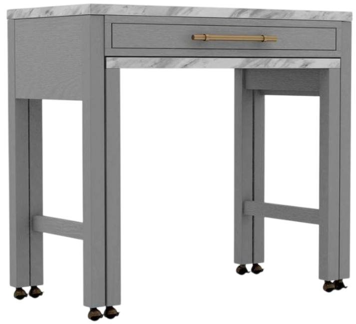 The matching stools come in the same light gray finish with upholstered fabric seats, And don't let the small stature fool you; the tabletop expands by virtue of the pullout sliding piece that rests on caster legs and tucks nicely underneath the tabletop. What you get is a kitchen that responds to your needs and transforms to whatever the occasion requires.