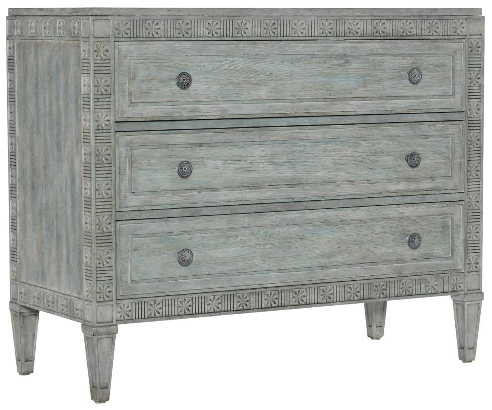 Capturing the vintage charm of the coastal South, the Charleston three-drawer accent chest has carved floral fretwork accents and tapered legs. Crafted of maple veneers with a solid-wood edge top, it is finished in waterscape blue, a transparent blue-green coloration allowing you to see the natural grain of the wood.Read More