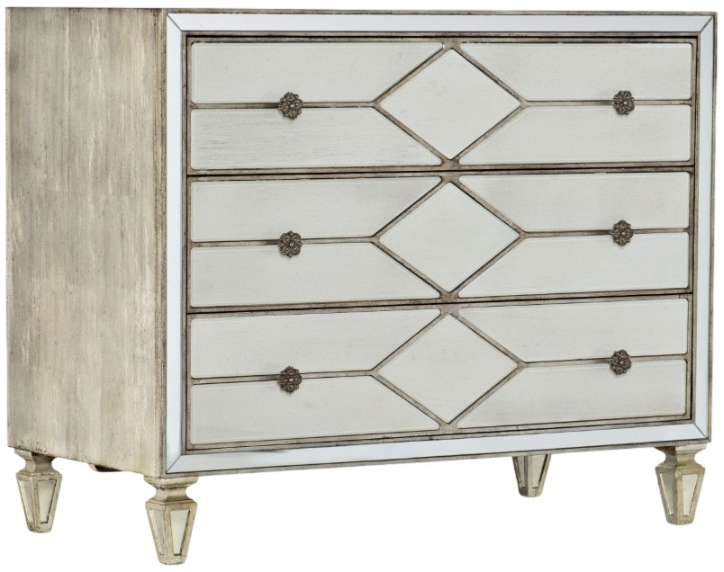 Simply magical, this shimmering beauty adorned with reverse painted glass drawer fronts in a creamy white finish looks like it belongs in a fairytale with a happy ending. The dreamy drawer fronts are paired with a silver finish on the case with rich undertones of gold and champagne.Read More