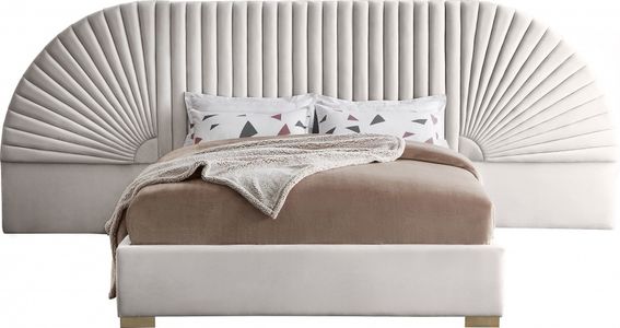 Enjoy sweet dreams in this beautiful Cleo velvet king size bed. The tall, luxurious velvet headboard is upholstered in a channel-tufted style, flanked by removable fan-shaped side pieces. The footboard and rails are comfortably upholstered in soft velvet as well, with gold steel legs supporting the frame.Read More
