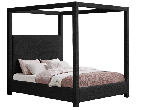 The airy canopy, draped in the same luxurious black boucle fabric, creates a sense of intimacy and seclusion, transforming your sleeping space into a private sanctuary