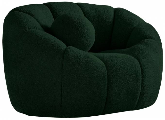 It comes with an accent pillow for even more welcoming comfort, and the chair is upholstered all over with rich green boucle fabric that beckons you to sit, rest, and take it easy.
