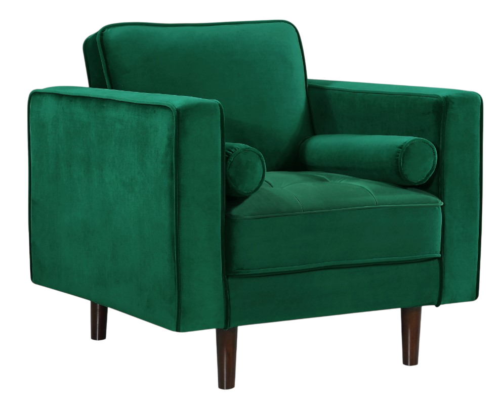 The Meridian Furniture Emily green chair features plush green velvet upholstery with deep tufting and two bolster pillows for added comfort. Its wide seat and sturdy wooden frame combine elegance and relaxation, making it an inviting accent for living spaces seeking a touch of color and luxurious texture.Read More