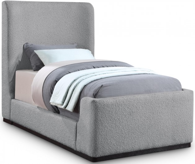 Make a bold statement with this stunning Oliver twin-size bed from Meridian Furniture. Its contemporary design is comprised of rubber wood with a solid wood black wire brush finish, upholstered with rich grey boucle fabric, giving it an elegant appearance.Read More