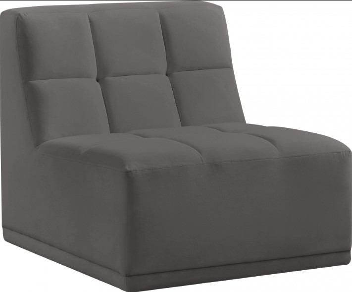 Bolster a contemporary vibe in your living room with this Relax grey velvet armless chair. Soft grey velvet upholstery offers delicate comfort, making this chair cozy for anyone who sits in it. Biscuit tufting gives this chair texture and its lack of arms creates modern style and elegance to your living space.Read More