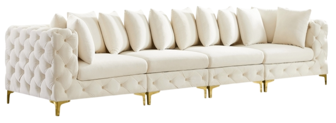 Lean back and relax on this Tremblay sofa. Featuring soft cream velvet upholstery with deep button tufting, this sofa adds a bold touch to any living space. A complete set of gold and chrome legs are included, so you can change it up to suit your home décor.Read More