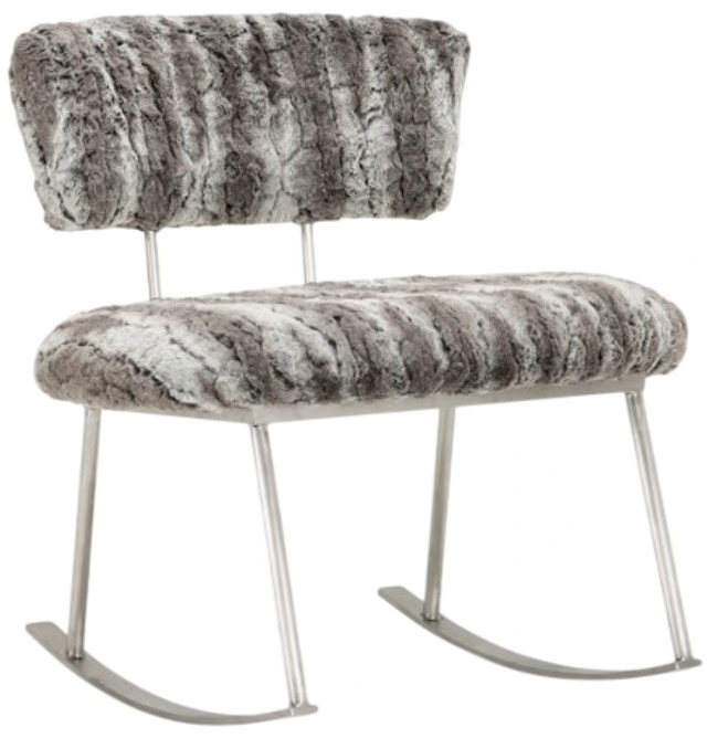 The Michael Amini® A La Carte Pebble Beach Rocker Chair is a stylish and comfortable addition to any living space. Featuring a brushed silver metal frame and plush faux-fur upholstery, it offers both durability and luxury. The chair's unique rocking design and cushioned seat and back provide exceptional comfort.Read More