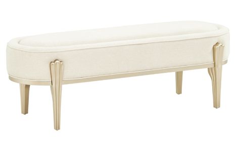 The Camellia Field caramel bench offers a functional accent for the foot of your bed or any space in need of additional seating. Upholstered in soft chenille with subtle channeling details, the bench exudes texture and craftsmanship. Its champagne gold-finished legs, featuring sculptural details.Read More