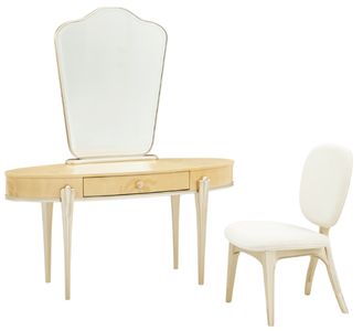 The Camellia Field warm pecan vanity set includes a graceful vanity desk with a warm caramel mahogany veneer top, velvet-lined drawer, and the signature camellia flower knob. Paired with a gently curved mirror framed in champagne gold and a matching upholstered chair in soft chenille.Read More