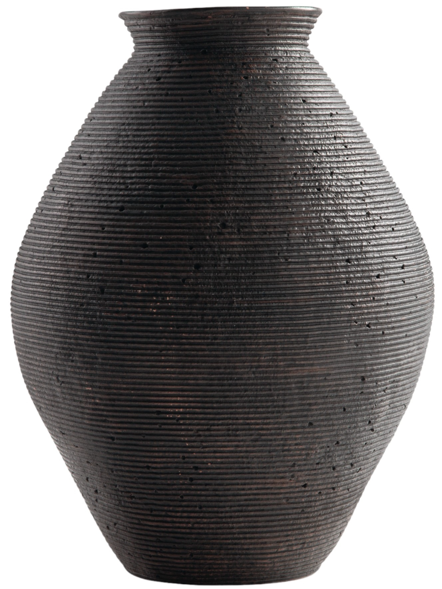 This vase features ribbed textural rings that add a rich, artisanal feel. Its antiqued brown finish enhances the earthy charm, creating a warm and inviting presence. Perfect as a centerpiece or accent, it blends rustic character with timeless elegance, making it a standout in any space.Read More