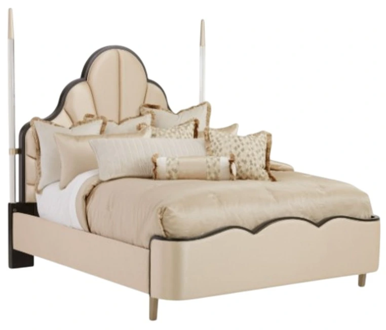 The Michael Amini® Malibu Crest Beige/Dark Espresso Upholstered Poster Bed showcases timeless elegance with a luxurious touch. Featuring a gracefully upholstered headboard in soft beige and a rich dark espresso-finished frame, this bed is designed to make a statement. The refined poster accents add grandeur, making it a stunning bedroom centerpiece.Read More